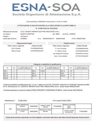 Per l’esecuzione di opere nell’ambito degli Appalti Pubblici, S.I.E.I. S.r.l. è in possesso delle idonee attestazioni SOA di qualificazione all’esecuzione di Lavori Pubblici. Nell’ambito della gestione Ambientale S.I.E.I. S.r.l. è in grado di procedere al trasporto in conto proprio dei rifiuti prodotti dalle lavorazioni